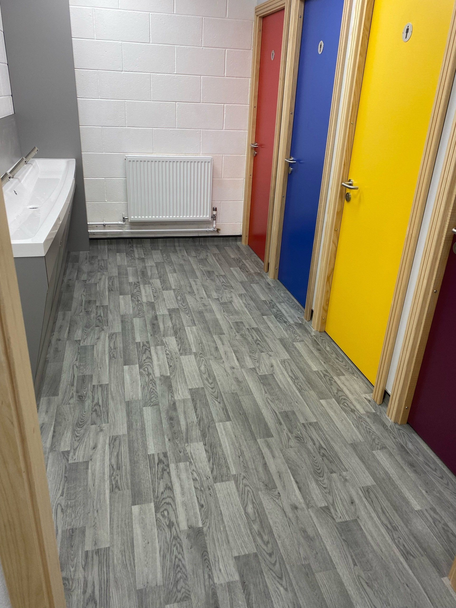A SERVICE WE PROVIDE IS TO DISMANTLE TOILET CUBICALS FOR A SEAMLESS FINISH TO YOUR NEW CAP AND COVE VINYL SAFTEY FLOOR ALONG WITH PAINTING AND DECORATING.